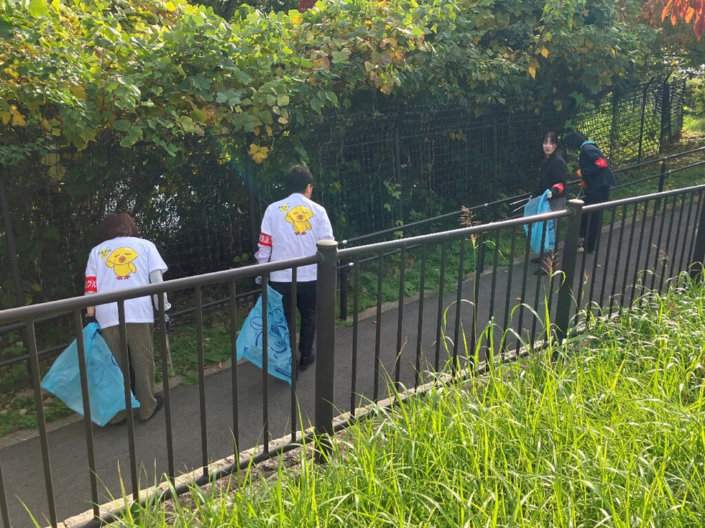 紅葉が色づく心地よい気候の中、お揃いの「かむぴよTシャツ」も着用し、総勢105名で清掃に励みました!
