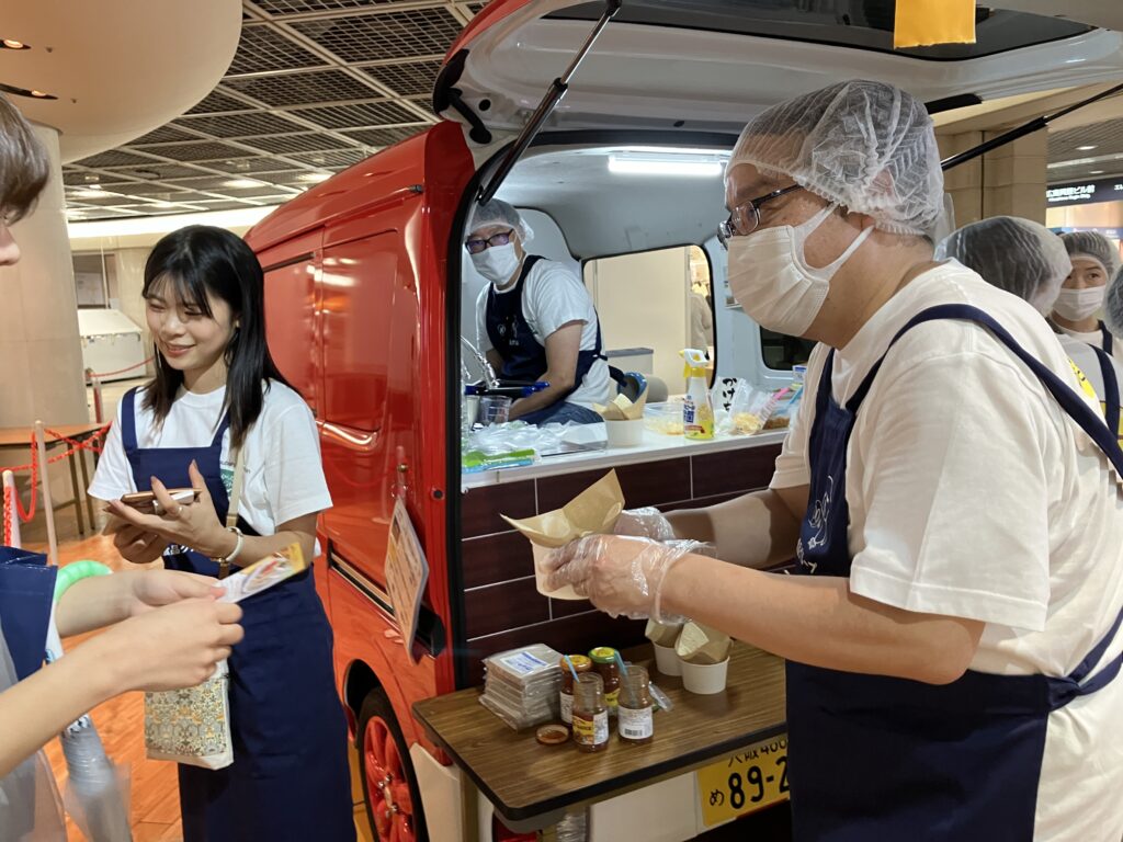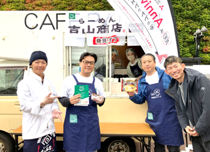 そして、一部の時間帯で、札幌吉山商店 監修「焙煎ごまみそらーめん」をキッチンカーで提供しました。札幌吉山商店の関山社長にもお越しいただき、たくさんのお客様に試食を楽しんでいただきました。