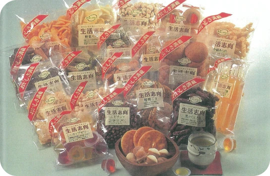 1970年ごろから、「袋詰菓子のプライベートブランド商品」を発売します。爆発的なヒットとなり、のちに有力メーカーとタイアップする商品開発への第一歩となりました。写真はプライベートブランド商品の一例。